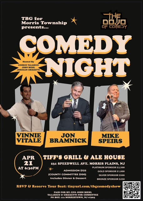 TBG for Morris Township presents a night of comedy at Tiff’s Grill & Ale House featuring a lineup of standout performers, plus dinner and dessert.